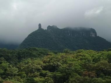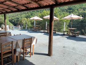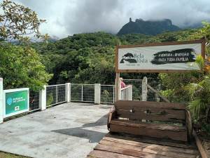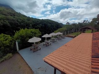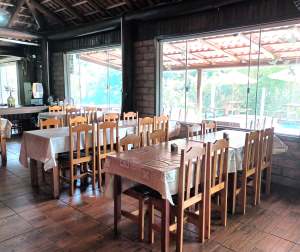 Salão agradável e climatizado. Linda vista para as montanhas e a pedra Dois Dedos, o pico(na foto do meio acima) e espaço externo para estar mais ao natural