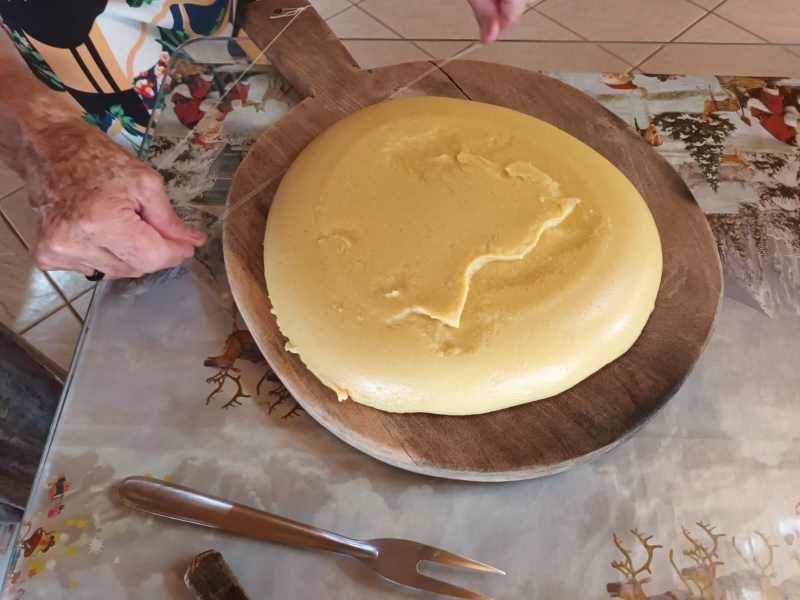 Corte da Polenta pelas mãos habilidosas da Sra. Marilde. Brinde com Espumante de Parceiro do sulacontece.com