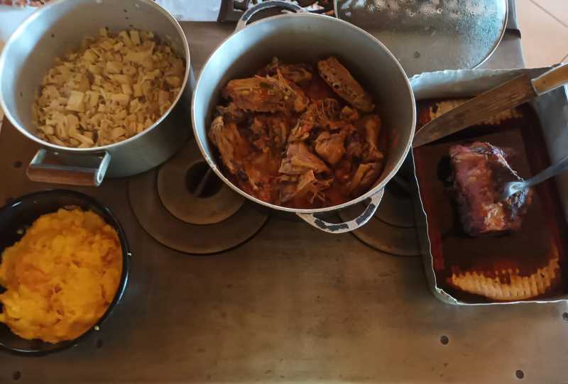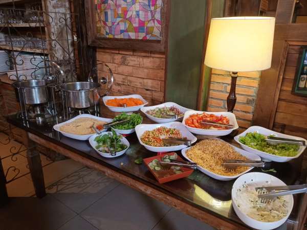 Saladas, Carne Assada, Frango e Peixe, Macarrão, Arroz, Feijão além da tradicional Farofa de Pinhão. Abaixo, prato montado a partir do Buffet, com Frango, Peixe e Farofa Pinhão