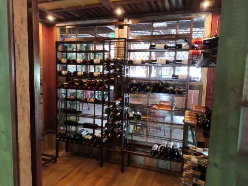 Adega no centro do espaço com diversos ambientes. Vinho nãopoderia faltar em se