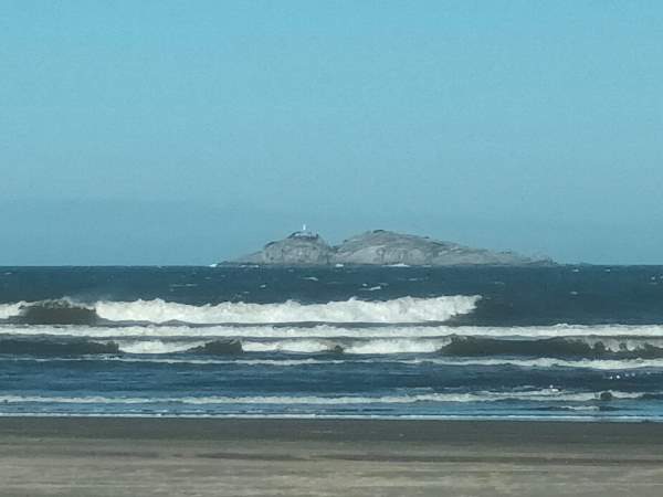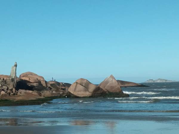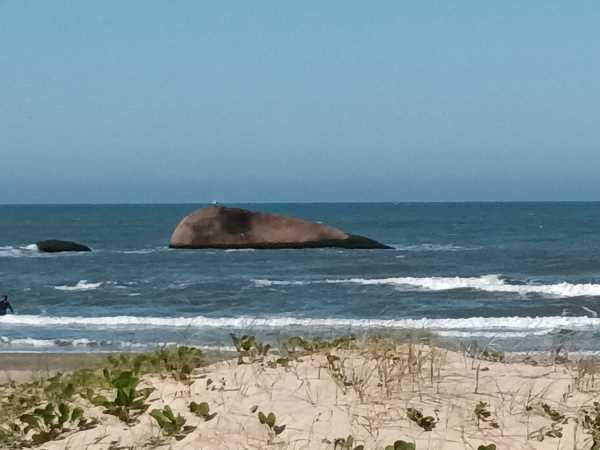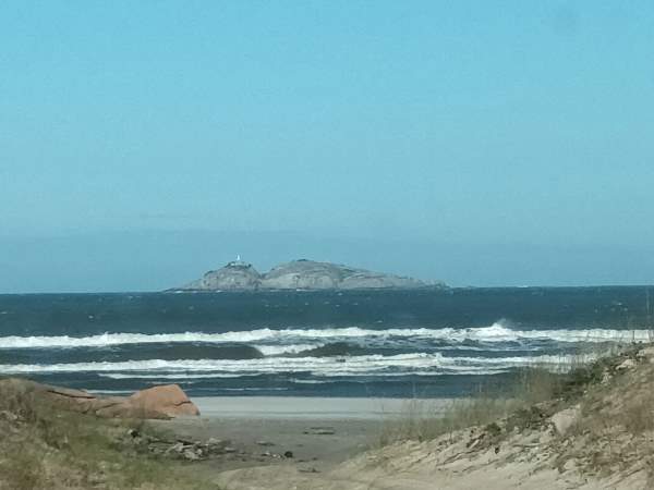 Paisagem inclui farol na ilha, a Pedra da Baleia, a Pesca