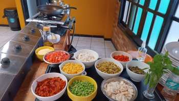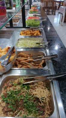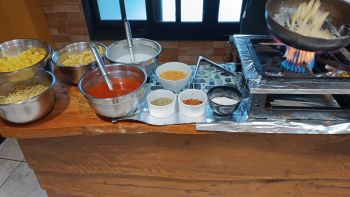 Localizado numa esquina, oferece Buffet de pratos quentes, de Saladas e Sobremesas além das Massas em que o cliente escohe livremente insumos e temperos(na imagem acima os insumos)