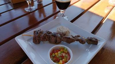 Provamos os Espetinhos de Alcatra e Linguiça Blumenau. Deliciosos, acompanhados por "Bier" de Jaraguá do Sul, cidade vizinha