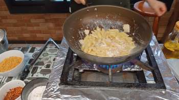 Repare no "timing" da imagem da direita acima, em que as chamas sobem e a massa na frigideira acompanha o movimento, "pulando" pelo movimento da mão da Chef