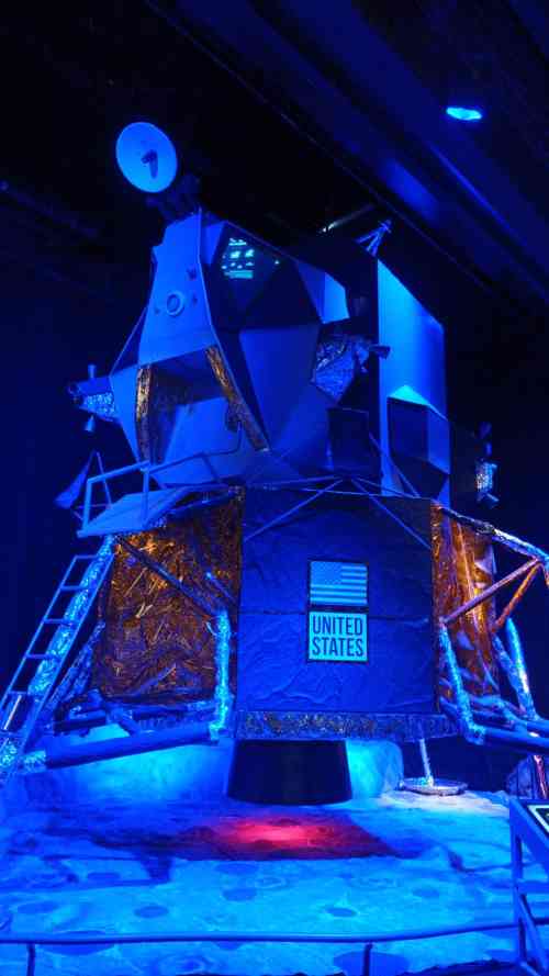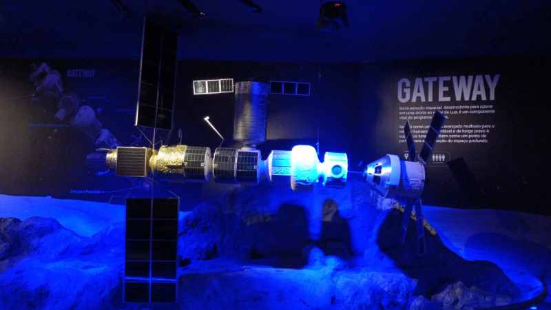 NASA cedeu 200 ítens expostos em uma das salas. Pontos onde as diversas missões aterrisaram na superfície da Lua demonstrados por miniaturas das capsulas que pousaram por lá