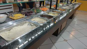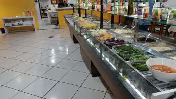 Localizado numa esquina, oferece Buffet de pratos quentes, de Saladas e Sobremesas além das Massas em que o cliente escohe livremente insumos e temperos(na imagem acima os insumos)