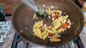 Repare no "timing" da imagem da direita acima, em que as chamas sobem e a massa na frigideira acompanha o movimento, "pulando" pelo movimento da mão da Chef